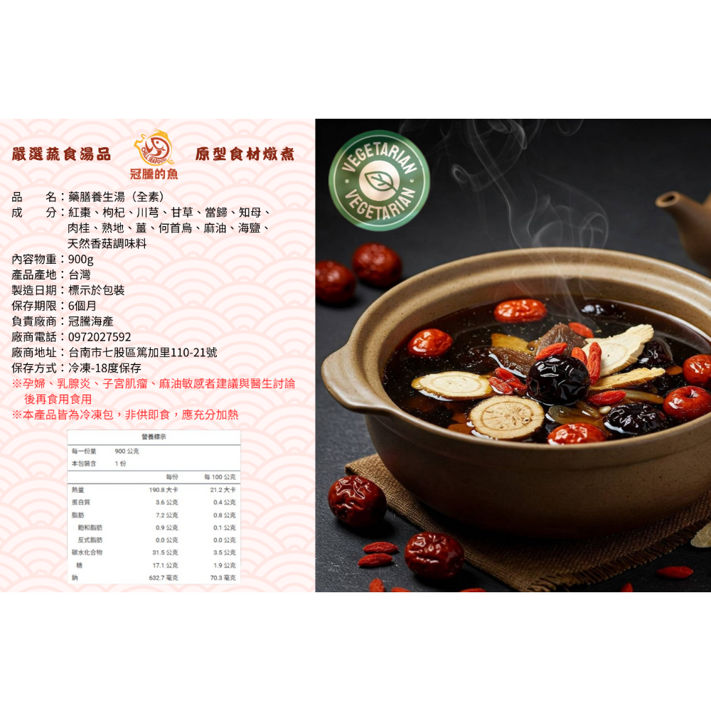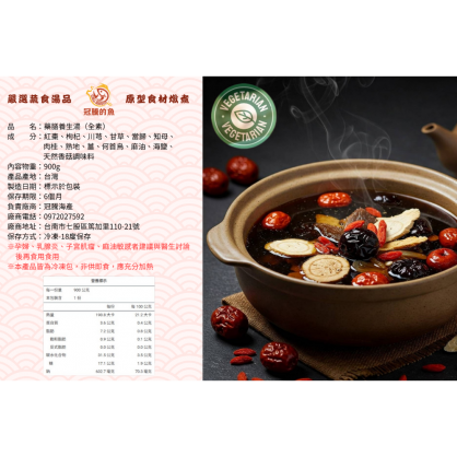 紅棗、枸杞、川芎、甘草、當歸、知母、肉桂、熟地、薑、何首烏、麻油、海鹽、天然香菇調味料
